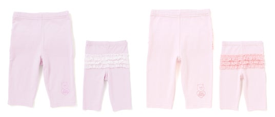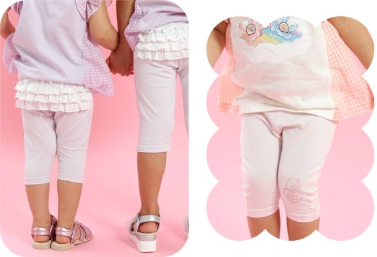 3段重ねした後ろのフリルがキュートなレギンスです。5分丈で暑い夏も爽やかに過ごせるのが嬉しいアイテム。通園・通学などデイリー使いから、お出かけにも履きたくなるかわいいデザインです♪