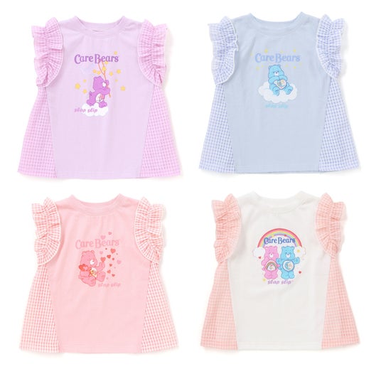カラーによってイラストが違うデザインが楽しい4色展開です。ベビーサイズは柔らかなタッチのケアベアたち、キッズサイズはPOPなカラーのケアベアたちがプリントされています。