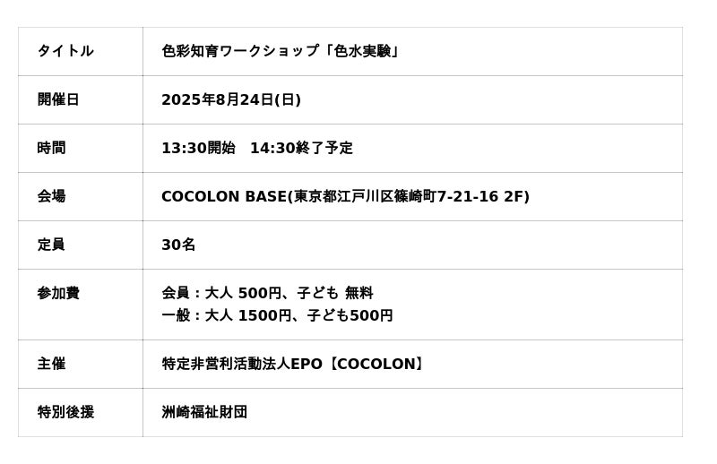 重症心身障がい児のと家族や支援者向けに学び・遊び・情報を提供をする「COCOLON」(運営:特定非営利活動法人EPO、東京都江戸川区、代表:齋藤えりか)は、2025年8月24日に重症心身障がい児と家族・きょうだい・支援者を対象としたワークショップを開催します。色彩知育の手法を学び、言葉でコミュニケーションをとることが難しいお子様とのコミュニケーションについて再考するワークショップです。