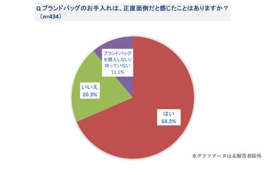 ブランドバッグのお手入れについては、「正直面倒だ」と感じたことがあるかの問いに、68.2%が「はい」と答えました。汚れや傷のメンテナンスの難しさがストレスになっていることが示されています。「いいえ」と回答したのは20.3%に留まり、バッグのメンテナンスが大きな負担となっていることが分かります。さらに、「ブランドバッグを購入しない/持っていない」と回答した人も11.1%を占め、メンテナンス問題を避けるための選択肢を取っている場合があることが考えられます。