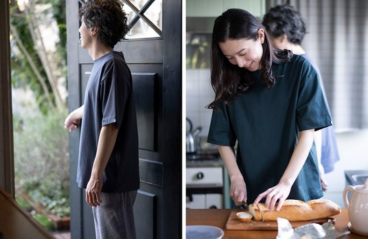 ”寝るため”のTシャツは、世界中で生産される綿花のうち5%しかない希少な超長綿を紡績し、高度な技術によって3本の糸を1本に撚り合わせた「三子糸」のTシャツ。まるでシルクのような肌触りと、内側から輝くような美しい光沢が生まれます。透けや、お洗濯が気にならないのも”三子糸”の魅力の一つ。