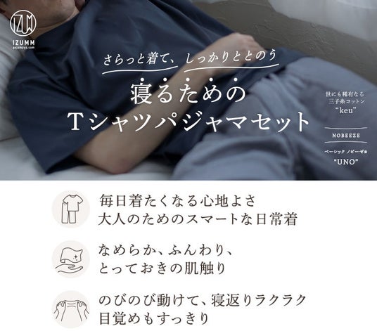 【新商品】寝る時Tシャツ派必見!『”寝るため”のTシャツパジャマセット』が誕生。「なめらか×ふんわり」が全身を包む、大人のスマートな日常着がパジャマ屋IZUMMより登場。<株式会社フレックス>