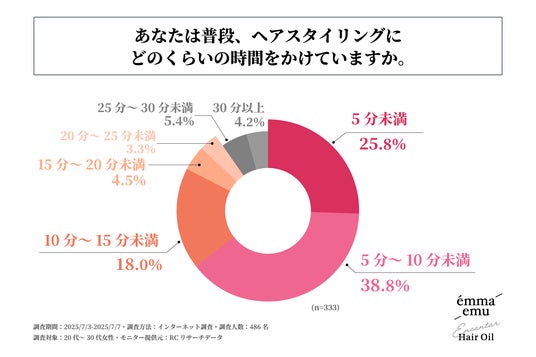 普段、自身でヘアスタイリングをする20代~30代の女性が、ヘアスタイリングにかける時間で最も多いのは「5分~10分未満」