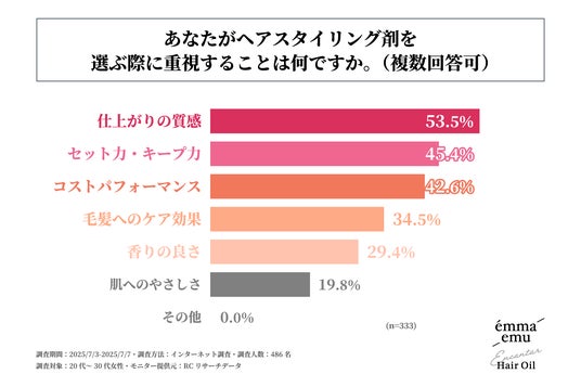 調査の最後、「ヘアスタイリング剤を選ぶ際に重視すること」を尋ねる設問への回答では、1位が「仕上がりの質感」で53.5%、2位が「セット力・キープ力」で45.4%、3位が「コストパフォーマンス」で42.6%という結果になりました。この結果から、ヘアスタイリング剤を選ぶ際に最も重視することは、「仕上がりの質感」であることが明らかになりました。