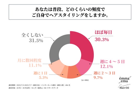 まず、「普段、どのくらいの頻度でご自身でヘアスタイリングをするか」を尋ねる設問への回答では、1位が「全くしない」で31.5%、2位が「ほぼ毎日」で30.3%、3位が「週に4~5日」で12.1%という結果になりました。2位と3位の回答を合計すると回答率40%を超える形となり、この結果から、20代~30代の女性の4割以上が少なくとも週4日以上、自身でヘアスタイリングをしていることが明らかになりました。
