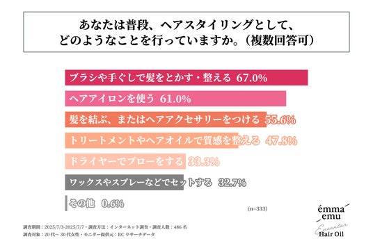 続いて、普段、自身でヘアスタイリングをすると回答した人を対象に「普段、ヘアスタイリングとして、どのようなことを行っているか」を尋ねる設問への回答では、1位が「ブラシや手ぐしで髪をとかす・整える」で67.0%、2位が「ヘアアイロンを使う」で61.0%、3位が「髪を結ぶ、またはヘアアクセサリーをつける」で55.6%という結果になりました。この結果から、普段、ヘアスタイリングで行っていることで最も多いのは、「ブラシや手ぐしで髪をとかす・整える」であることが判明しました。