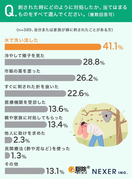■蜂に刺された時の対処、41.1%が「水で洗い流した」