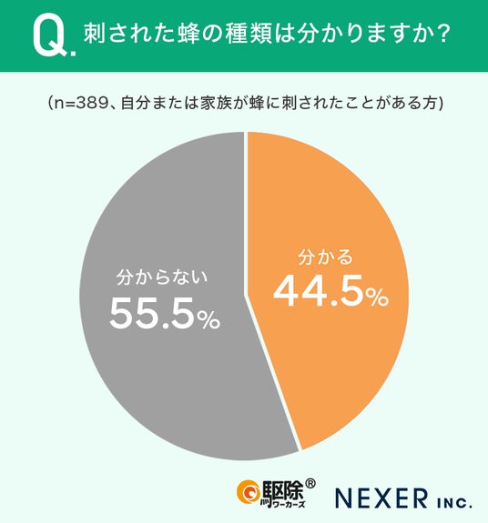 44.5%の方が、刺された蜂の種類が「分かる」と回答しています。
