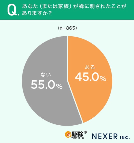 【あなたは経験ありますか?】45%が、自分自身または家族が蜂に刺されたことが「ある」。どう対処した?