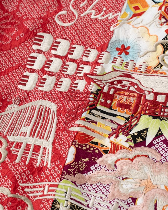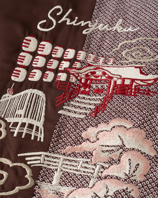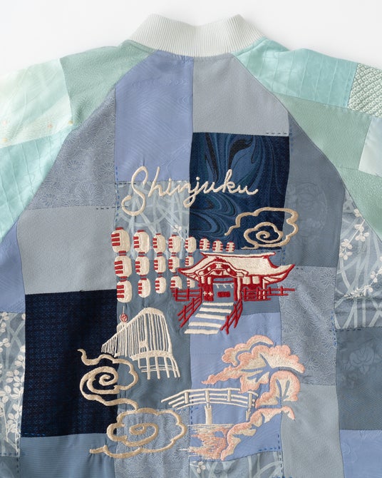 本イベントの開催を記念して制作した、すべて1 点ものの数量限定スペシャルアイテム。子供の健やかな成長を願い端切れを縫い繋げる「百徳着物」に着想を得て、ヴィンテージキモノをパッチワークのように継ぎ接ぎした「ジャケット」に、オリジナルの刺繍を施した特別なシリーズとなっています。背中には「伊勢丹新宿店」を含む「神社」や「庭園」、「桜」などの新宿の風景を「横振り刺繍」で表現しています。日本の職人の技術によって生み出されたスペシャルアイテ