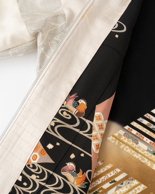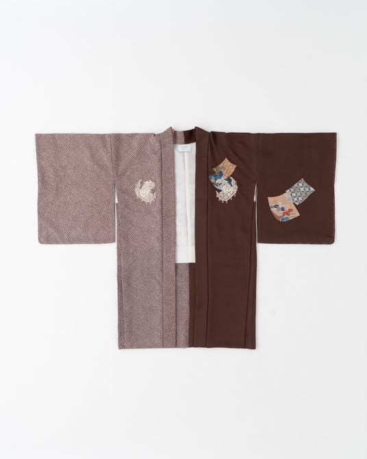 現代では希少な、絞り染めやろうけつ染め、加賀友禅、京友禅、辻ヶ花などの技法が施された着物で仕立てた羽織。左右異なる着物を刺繍で折衷したアシンメトリーなデザインのアートピースです。