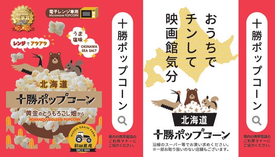 前田農産食品株式会社(本社:北海道中川郡本別町)は、自社で生産するポップコーンを使用した、電子レンジで簡単に熱々が食べられる「北海道十勝ポップコーン」のパッケージをデザインした吊手広告を開始する。