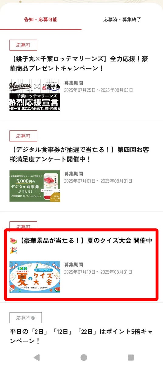 銚子丸公式アプリ内にある「イベント・抽選会」にてクイズ大会を開催中(全10問)。キャンペーン期間中、クイズにご解答ください。抽選で景品をプレゼントいたします。【満点賞】