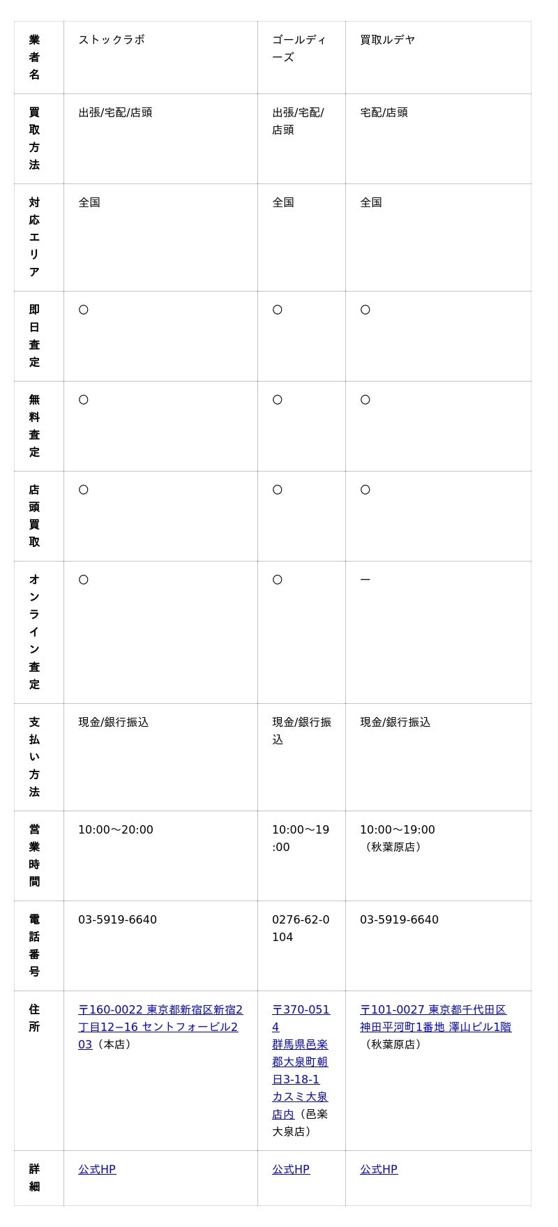 ライン査定から宅配買取していただきました。 他の高価買取NO1を謳うお店より倍くらい高く買い取っていただきました。 ストックラボさんの査定額を伝えると、販売価格と同額だから難しいと言われたので本当に高値で買い取ってもらえたのだと思います。 また次も利用したいです。