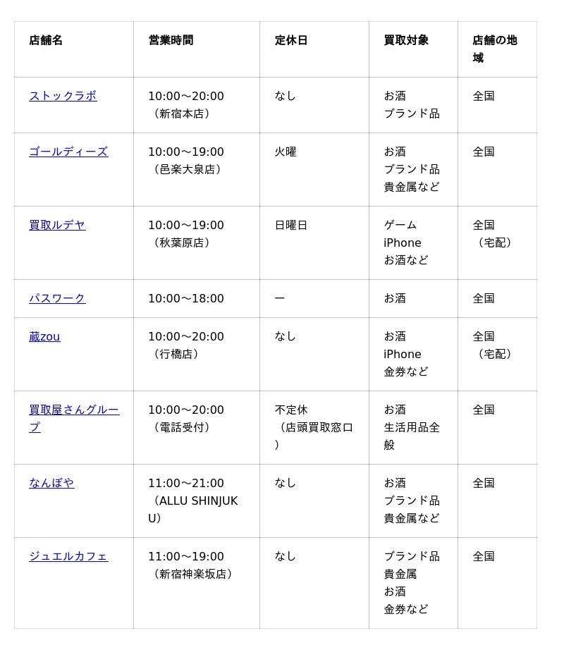 では、イチローズモルトの買取におすすめの業者を紹介しましょう。まず、各業者の営業時間などの主要情報をまとめた一覧表からご確認ください。