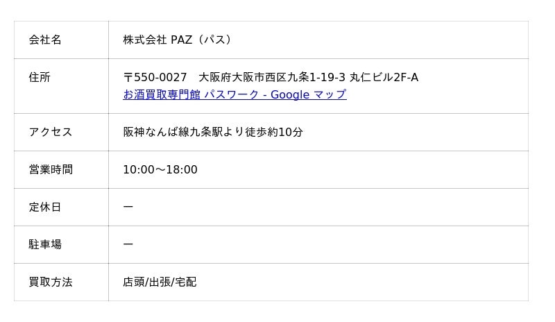 パスワークは、大阪・西区に店舗を持つお酒専門の買取店です。全国対応で宅配買取を行い、お客様の負担は0円の手軽な買取を行っています。