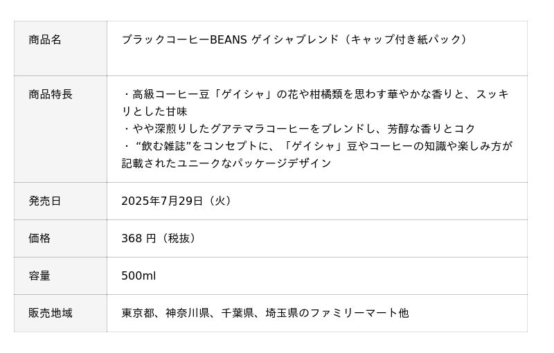 本ブランドは、「ワインのように奥深いコーヒーの世界をもっと多くの人に知って、楽しんでもらいたい」という想いから、“飲む雑誌”というコンセプトのもとに誕生。第一弾の“創刊号”では、希少な高級豆「ゲイシャ」を使用した『ブラックコーヒーBEANS ゲイシャブレンド』(500mlキャップ付き紙パック/価格:368円税抜)を、7月29日(火)より首都圏(東京都・神奈川県・千葉県・埼玉県)のファミリーマートから発売します。