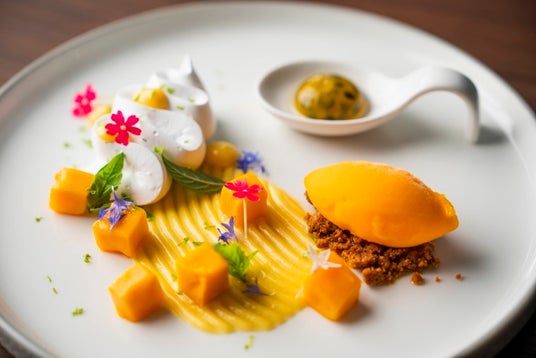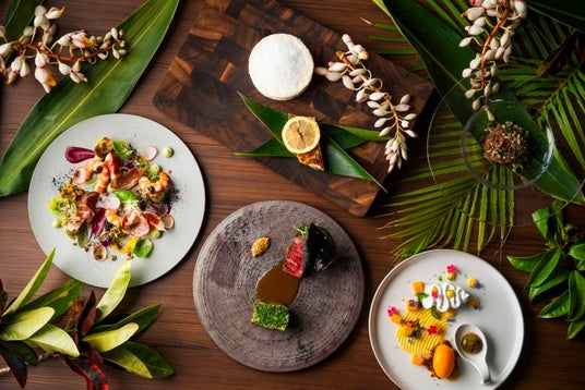 沖縄食材をふんだんに使った10日間限定の「スペシャルサマーコース」です。コースは「車海老と無花果のガルグイユ」や「島豚キャビア」の前菜からはじまり、「本部産本マグロのタルタル」をフレッシュハーブと島唐辛子で爽やかに仕上げた一皿を提供します。続いて魚料理には、沖縄の三大高級魚の一つである赤仁ミーバイを宮古島の月桃塩釜で包んで焼いた「赤仁ミーバイの月桃塩釜焼」、メインには「本部牛サーロインと牛タンのグリル」を、名護産とうもろこしとオリオンビールのソースでお楽しみください。デザートには「沖縄県産マンゴーとパッションフルーツ」をご用意。沖縄の魅力を一皿ごとに感じられるコースをお楽しみください。