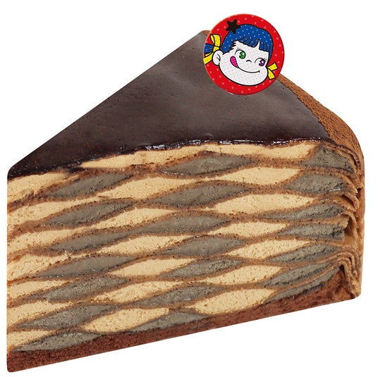 チョコクリームとミルクチョコクリームをココアクレープ生地に絞り、アーガイル模様に重ねました。上面は艶やかなチョコグラサージュで真っ黒に仕上げた、不二家ならではのミルクレープです。