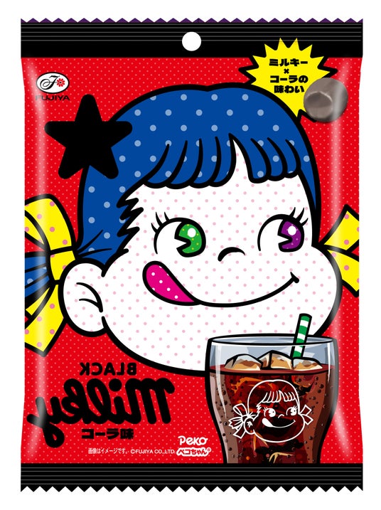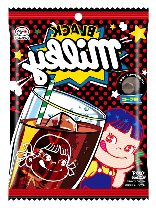 不二家のロングセラー「ミルキー」より、「裏不二家の日」のテーマカラー「ブラック」な色合いのコーラ味を期間限定で発売します。裏デザインのパッケージにもご注目ください。