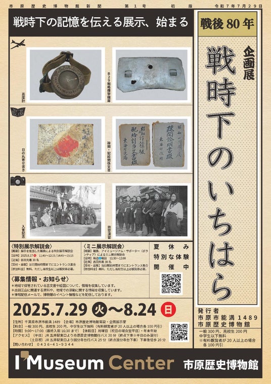 市原歴史博物館で企画展「戦時下のいちはら」を開催しています。戦後80年の節目の年を迎え、戦争当時を直接知る人が減り、戦争体験を伝承することが難しくなるなか、市内に残された記録類や資料は、戦時下のいちはらを知る重要な手がかりとなっています。