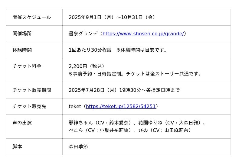 株式会社書泉(代表取締役:手林大輔)は、日本出版販売株式会社(代表取締役社長:富樫 建、略称:日販)と、イマーシブ音声コンテンツ「ボイスフレンド」の新イベント「邪神ちゃんドロップキック 魔泉グランデからの脱出」を、2025年9月1日(月)から10月31日(金)までの期間、書泉グランデ(東京・神保町)にて開催します。