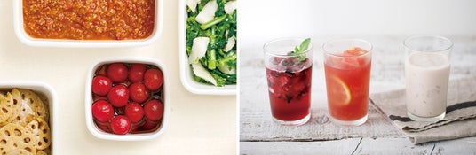 「純米 赤酢」を使った料理・ドリンクの一例(ミニトマトの赤酢マリネ、赤酢ベリーソーダ、赤酢グレープフルーツ、赤酢ももミルク)