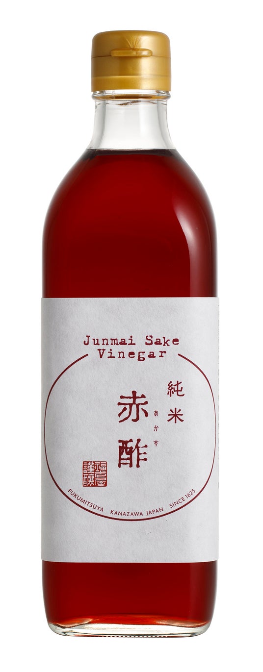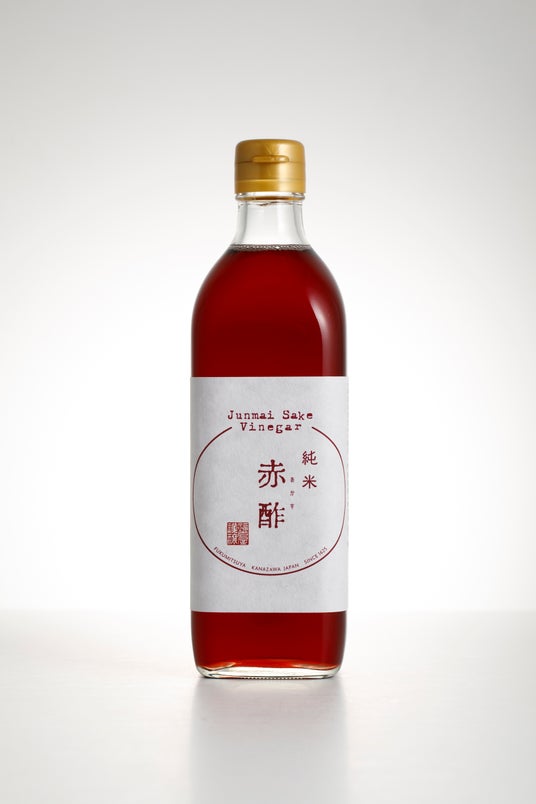 「純米 赤酢」はその伝統技術を生かし、金沢の今川酢造と共同開発した純米酢。厳選した国産米を使用し丹念に仕込んだ純米酒から、約3ヶ月間じっくりと時間をかける「静置発酵」により醸造した、古代米由来の赤色が美しい「サケビネガー」です。この度、ラベルデザインは踏襲しながら、2002年の発売以来採用してきたコルク栓ボトル(370mL)から、片手で簡単に開閉できるヒンジ(蝶番)キャップボトル(500mL)にリニューアルいたします。