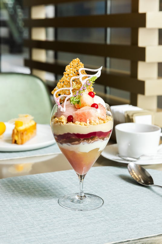 白桃の上品な甘みと、ハーブの爽やかな余韻が織りなす、香り豊かな夏のパフェ。今だけの味わいを、ぜひアルマーニ / カフェでお愉しみください。