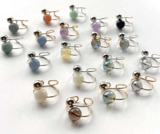 人気のオリジナルイヤーカフは、いろんな色の天然石でご用意。長くつけても痛くならない軽い付け心地。
