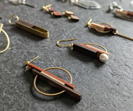 天然木に金属やアクリルなどの異素材を組み合わせたり、夏向けにアクリルと金属を使用したアクセサリーを制作。