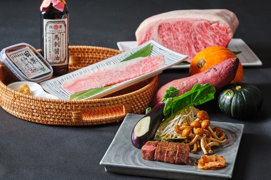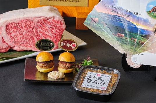 前菜は、エシカルなくまもとあか牛とくまもと黒毛和牛のハンバーガーの食べ比べを、高森町産の阿蘇もろみを使った風味豊かなタルタルソースとともに、お楽しみいただけます。メインディッシュには、くまもとあか牛のロースステーキと、馬刺醤油と山椒味噌で味わう焼きしゃぶしゃぶの2種を、無農薬で育てられた新鮮な熊本野菜とともにお届けいたします。