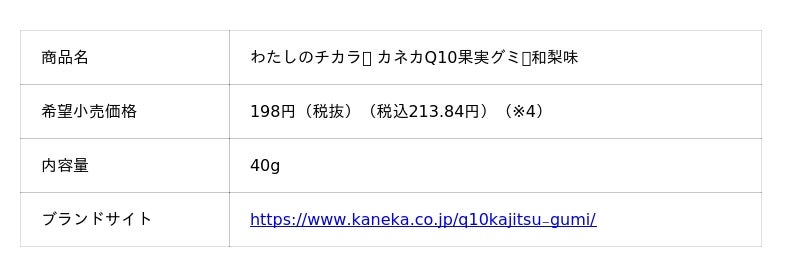 株式会社カネカ(本社:東京都港区、社長:藤井 一彦)のグループ会社であるカネカ食品株式会社(本社:東京都新宿区、社長:福崎 太)は、『わたしのチカラ(R)(※1)「カネカQ10(R)果実グミ」』の新しいラインアップとして、和梨味を7月29日(火)より全国のセブン‐イレブン 21,756店舗(2025年6月末時点)(※2)で順次先行発売します。