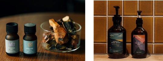 各種アメニティは、蓼科の森を守るために間伐されたカラマツから抽出した精油を使用しています。スチームサウナでは、アロマオイルを使って全身で香りに包まれる体験ができます。シャンプー、トリートメント、ハンド&ボディソープなどのバスアメニティや、オールインワンオイル、ルームミストもすべて、カラマツ由来です。バスアメニティとオイルは館内のショップでもお買い求めいただけます。森の恵みを活かしたプロダクトはギフトにもお勧めです。