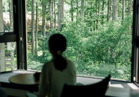大きな窓の外には四季折々に変化するまるで絵画のような景色が広がります。風に揺らぐカラマツのさざめき、森を流れる小川のせせらぎ、小鳥のさえずりを聴きながら、自然に溶け込む贅沢なひとときをお過ごしいただけます。