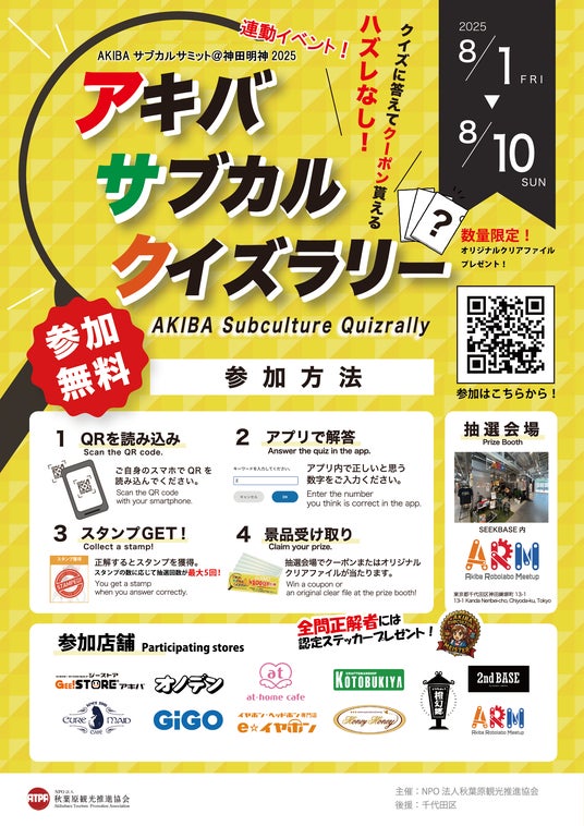 NPO法人秋葉原観光推進協会(ATPA:理事長 泉登美雄)は秋葉原の街全体を舞台にした参加型イベント「アキバサブカルクイズラリー」を2025年8月1日(金)から8月10日(日)までの期間で開催します。