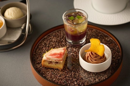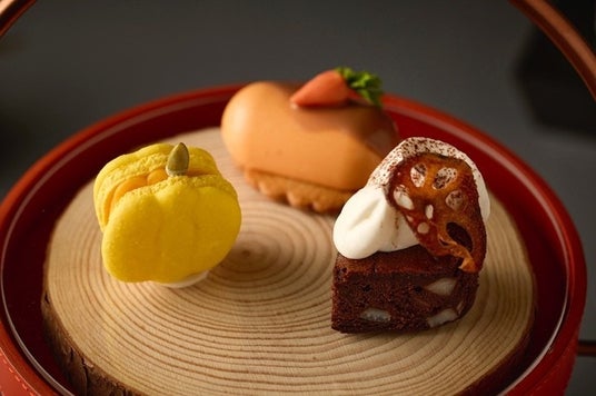 パティシエこだわりのスイーツは、葡萄や和栗など秋を代表する人気の食材をはじめ、かぼちゃ、蓮根、人参などの野菜を見た目も愛らしい秋色スイーツの数々に仕上げ、セイボリーやアミューズにも旨みや甘さが凝縮した秋の旬をたっぷりとお召し上がりいただきます。季節のスペシャリティドリンクは、秋にふさわしい深みのある味わいの黒烏龍茶と葡萄のモクテルをご用意いたします。