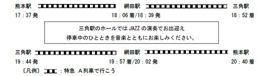 九州旅客鉄道株式会社では、「特急 A列車で行こう」車両を使用し、熊本から天草(三角)間を通常は運行していない夕方から夜の時間帯に往復で運行するツアーを発売しています。