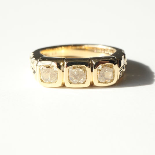 贅沢に配された3石のイエローダイヤモンドが、ゴールドの輝きと溶け合い、他にはない温かみと重厚感を放つ一本。リングサイドには、幾何学的に配置されたプリンセスカットのホワイトダイヤがさりげない煌めきを添え、全体に立体感とリズムを生み出しています。社名:岡田優子・WAI JEWELRY