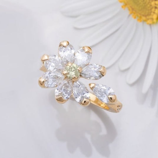 花占いの象徴、マーガレットをモチーフにした可憐でストーリー性あるフラワーリング。花占いをテーマにしているので、花びらを一枚散らした遊び心あるデザインに。花弁部のダイヤモンドの煌めきと中央の淡いイエローダイヤモンドの輝きに思わず目を奪われます。社名:田中妙佳・Tommelise