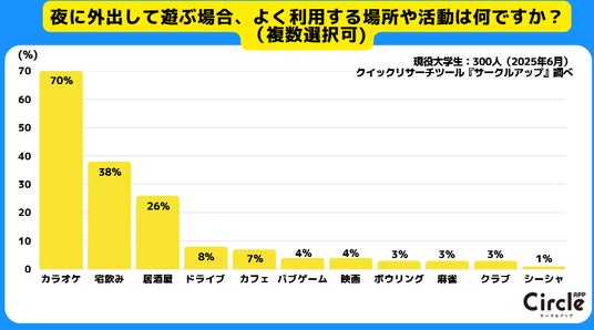 「よく利用する夜遊び」を複数回答で聞くと、カラオケが70%で不動の首位となりました。次いで宅飲み・宅ゲーが38%となり、居酒屋・バー(26%)を大きく上回りました。