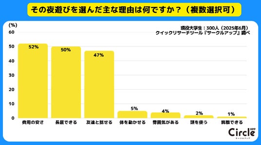 夜遊びを選ぶ理由のトップ3は、費用が安い(52%)、時間を気にせず楽しめる(50%)、友達と深く話せる(47%)でした。経済性に加え、終電を気にしない自由度とコミュニケーション価値が意思決定の軸になっています。やはり、朝まで気兼ねなく利用できる店として若者は価値を感じているようです。