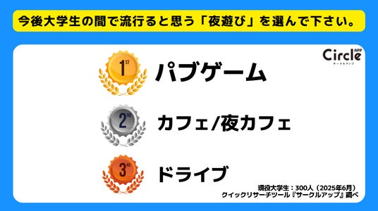 最後に、今後、大学生の間で流行ると思う「夜遊び」を聞いたところ、パブゲーム(26%)と夜カフェ(25%)がツートップに浮上しました。続いて夜景ドライブ(22%)、宅飲み/宅ゲー(18%)が加わります。