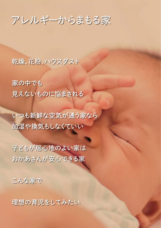 24時間換気で、窓を開けなくても新鮮な空気。花粉や黄砂、夏の熱風や虫を気にして窓を開けられない日でも安心。家全体が常に新鮮な空気に入れ替わるので、ハウスダストやアレルギーから子どもを守ります。