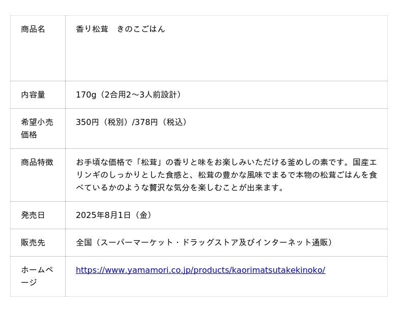 総合食品メーカー、ヤマモリ株式会社(本社:三重県桑名市、社長:三林 圭介)は、香り松茸 きのこごはんを2025年8月1日(金)より全国発売いたします。