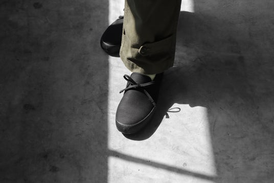 履口から伸ばした靴紐が印象的な外羽根デザイン。素材にはムラ糸で織り上げたバックサテンを使用し、織りの表情と光沢感が絶妙なバランスを生み出します。ミニマルな構造ながら、どこか民族的なムードを感じさせる一足です。スタイリングに取り入れやすい“IVORY”と“BLACKMONO”の2色展開。