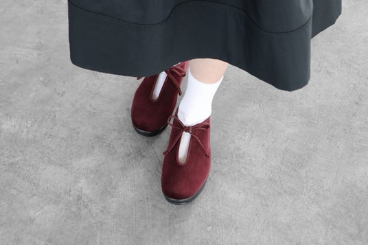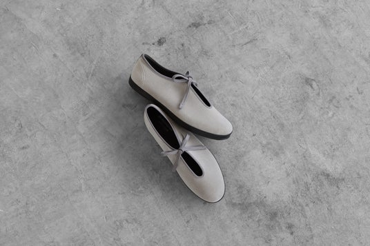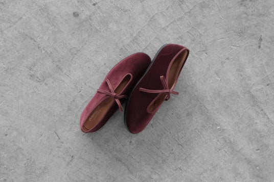 1枚仕立てのアッパーに、履口のパイピングをそのまま靴紐にしたシンプルな構造。柔らかく上品なフォルムに蝶結びがアクセントになっている一足。艶があるベルベットを使用しており上品な仕上がりとなっています。25FWシーズンでは、深みのある“BURGUNDY”と落ち着いたトーンの“LITEGRAY”が新色として登場。
