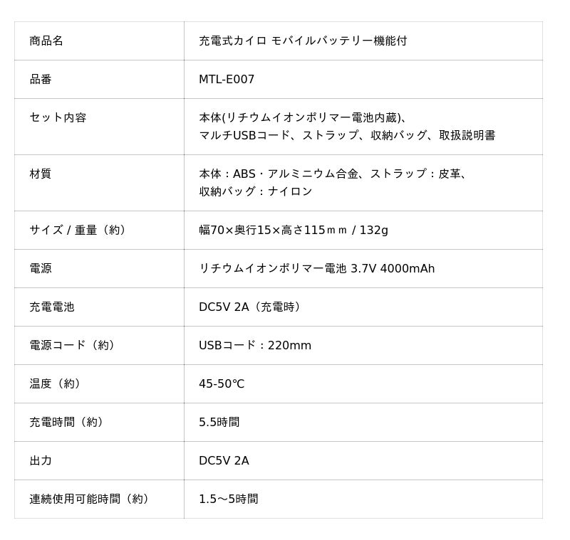 充電式カイロ モバイルバッテリー機能付 MTL-E007