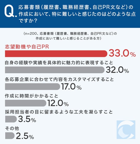 33%の方が、応募書類の作成でもっとも難しいのは「志望動機や自己PR」と回答しています。