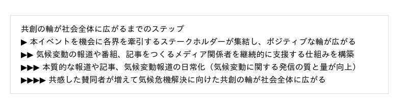 本イベントをきっかけに各界イニシアチブの皆さんと協力/連携した体制を整え、気候変動を解決するための継続的な仕組みを構築しております。